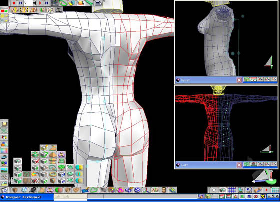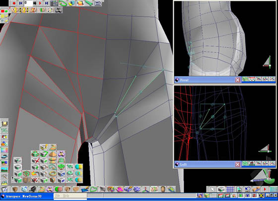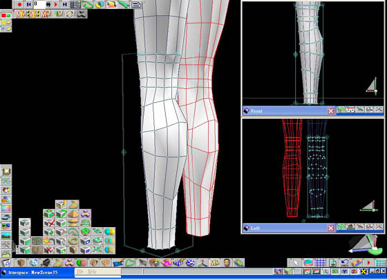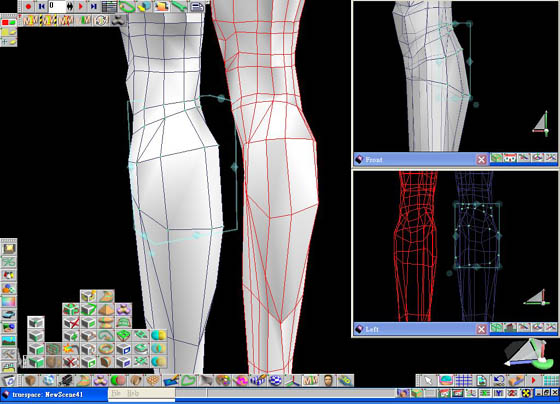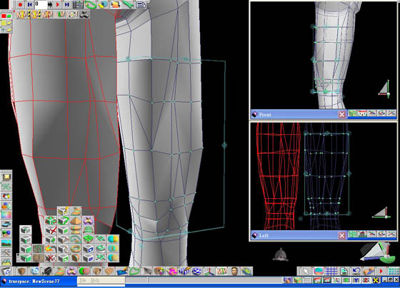 20. 現在把臀部和大腿間的部分增加三條線段,由於這邊是大腿關節轉動的地方,所以多增加一些線段可避免到時做動作時有錯誤的情況發生,如圖。 21. 接著把尾骨部分的線條刪除後再增加做編輯,再下來把恥骨到骨盆的地方也增加線條,然後再刪除不需要的線條,如圖,編輯腹部的點,把腹部做出來,不過不要太突出,有小腹就不好了。 22. 把腿型做好,然後把大腿擴大一點,再把膝蓋與小腿的部分增加線段,再編輯小腿及膝蓋,讓小腿的曲線出來,如圖。 23. 新增一條由腰部到膝蓋的線條1,接著也從臀部到膝蓋也增加一條,為了讓肌肉明顯一點,所以在大腿前方再增加一條線,在稍微修正點的位置,這樣大腿部份的肌肉就可以顯現出來了,如圖。 24. 接著把小腿及膝蓋的形狀做出來,由於線似乎是不夠,所以在膝蓋的地方再增加一條線並把膝蓋骨的部分調整的更明顯一點,現在再把小腿部分的肌肉用線條區分得更明顯,如圖,並且加以調整位置。 |