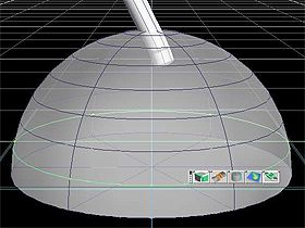 15. 將此 NURBS 球體轉正,如圖 15。我習慣上製作模型時都會對齊網格,通常都會位置以 x=0 及 y=0,故本範例中的模型都會以此為準。 16. 在步驟 14 中增加橫節數是為了製作造型用,視個人喜好設定此參數。在 NURBS 球體上按下滑鼠右鍵可進入編輯模式,先選擇底部上方的整列曲線,如圖 16a。在控制器的角落同時按下滑鼠左右鍵,可等比例的縮小此列曲線,如圖 16b。