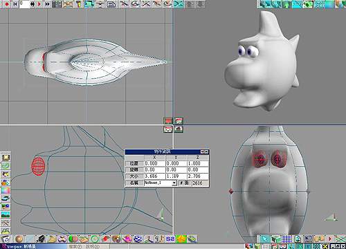 11. 擺設眼睛:將眼睛球體縮小,並擺放其位置;在本例中還將眼睛稍稍的拉成橢圓形,會比較卡通化一點,如圖11。