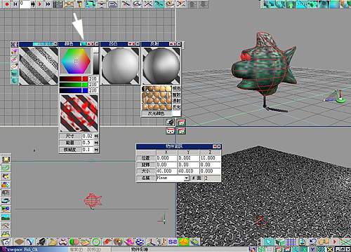 17. 水平面材質設定:若是材質編輯器中有先前的材質設定,可以在預覽視窗上按下滑鼠右鍵,從快顯清單中選擇->重新設定,清除材質編輯器的材質設定。並在透明度的選向上按下滑鼠右鍵 (圖17箭頭處),可開啟透明度質感樣式,並從其中選擇侵蝕的透明度效果,調整侵蝕的尺寸參數讓侵蝕的效果密一點,著色在平面上模圖17右下角的視窗。