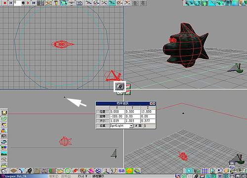 19. 加入聚光燈:在場景中加入一盞聚光燈,並將其移動到水面之上,如圖19箭頭處 (若市場景中已經有其他的光源,可以先從光源資料庫中選擇->無光源,來刪除所有的光源)。再選取聚光燈的模式下,將上視圖切換為->從物件檢視視窗 (在trueSpace除了攝影機外,還可以用聚光燈、投影光使用從物件檢視視窗,調整的方式與攝影機一般)。