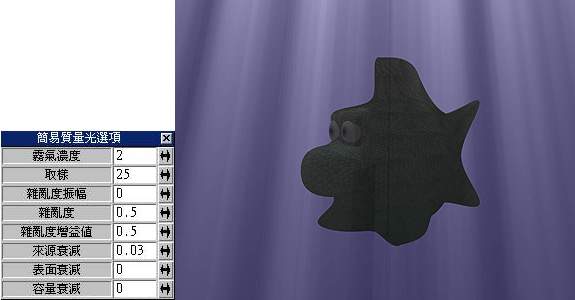 23. 質量光設定:光源衰減後質量光的效果也會有所改變,可以增加質量光的濃度,參數調整及著色後如圖23。若是覺得光線過暗的話,可以適度的補光。