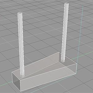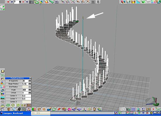陣列教學--旋轉梯有時在一些場景當中,我們會需要做到重複性高的模型,例如軍隊,鐵軌,旋轉梯等等,平常最一般的做法,就是不斷的複製再做排列,但是這樣做的話,往往會因為一些誤差,而使模型變得不整齊或是距離不同,在trueSpace6當中,Array Tools(陣列工具)則可以為您省下不少時間。 15. 請先建立一個長方體,並將其中一邊縮小,加上兩個圓柱,並且用等位聯結將所有物件連接起來,如圖15。