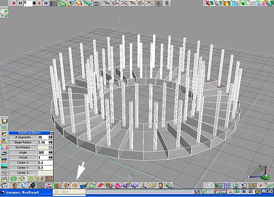 16. 按下物件建立半徑排列(Create Radial Array)之後再選一個點作為圓形陣列的原點,把設定物件跟隨半徑排列路徑(Toggle follow patch of radial array)打開。