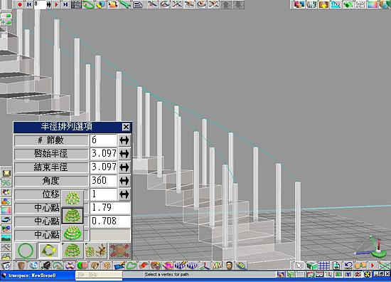 18. 按下半徑排列選項面板內的->選擇半徑排列物件上的點, 將通過此點的線建立為曲線,並選取圓柱的頂點,接著系統會提示"選擇頂點以建立路徑曲線",然後在扶手位置上選擇一個點,讓線條皆通過所有的圓柱。並重複此步驟再另一側的扶手上建立出曲線,如圖18。