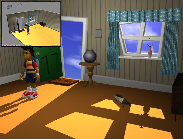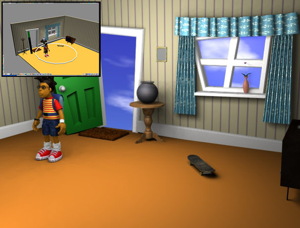20. 經由多種光線的結合,可以完成相當棒的效果 - 在我們的卡通式場景中結合了上述的三種光源,戶外的聚光燈、室內的泛光燈及室內的環景影像光源。