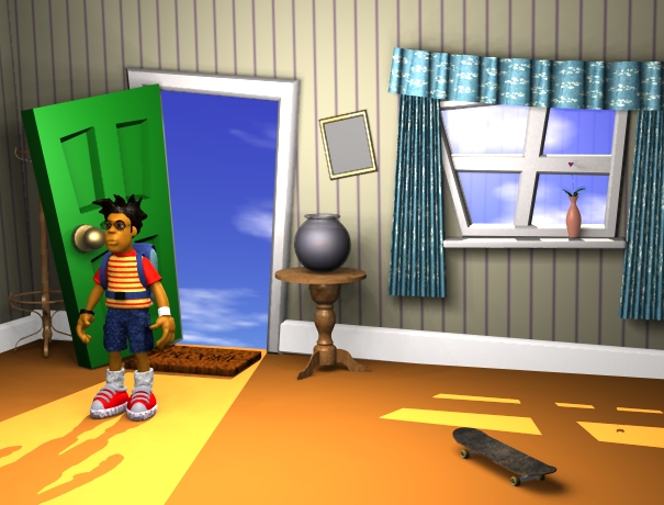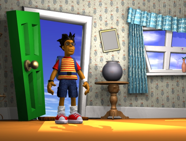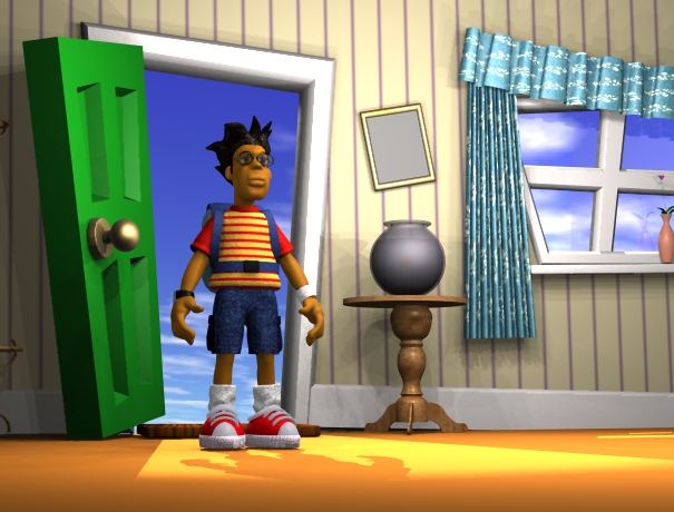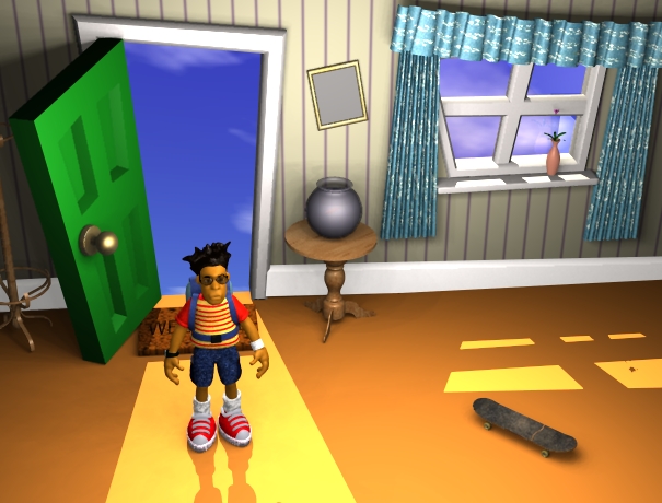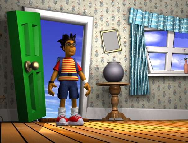 設定場景 21. 為了要強調卡通式的效果,可以調整物件的尺寸、旋轉與位置 - 可以讓門的把手與牆上的畫框大一點,如畫面中我們所調整的狀態。