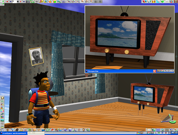 28. 接下來再電視的螢幕上貼上一塊熱帶海灘的影像,不像 2D 平面的影像,在 3D 中我們可以從任何的角度檢視。這個歪歪斜斜的物件,是不是在我們貼上影像之後,變的生動許多了呢?