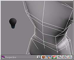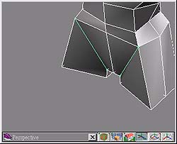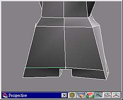再來我們要處理臀部部位了,其做法和胸部類似,但很可惜的,天不從人願,這兒的 面積並不方正,所以我們就只好靠自己來修改和創造我們要的面積了,首先選取這 兩條礙眼的線段,如下圖 44,然後執行消除頂點功能,如下圖 45,這兩條線從此不 見了.