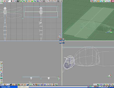 3. 再增加「平面」物件縮放大小與位置,成為後翅。 4. 將前翅與後翅位置調整至相對位置上,將其連結好等待貼圖的完成。