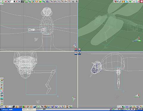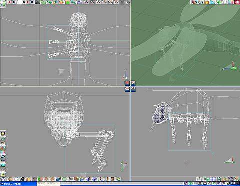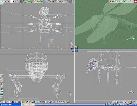 5. 暫時先將三隻腳作連結,並調整軸心位置,再按下鍵盤「Ctrl+C」複製另外一邊的腳,再到上視圖選擇「旋轉物件」工具,作旋轉 180 動作之後使用「鏡射」工具。 6. 調整好腳的位置,模型部分至此即告一段落,如圖。