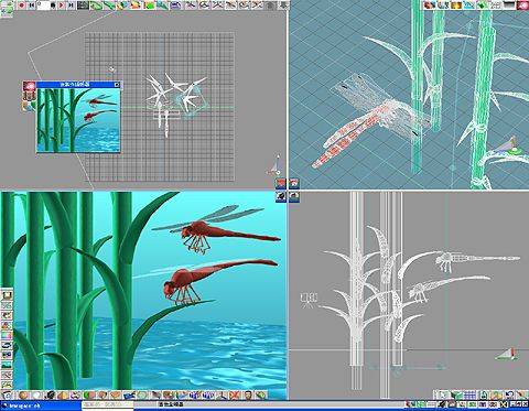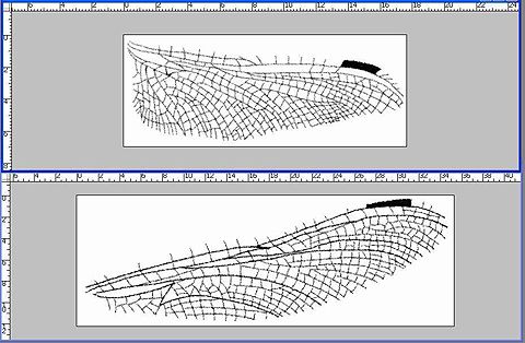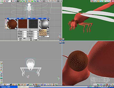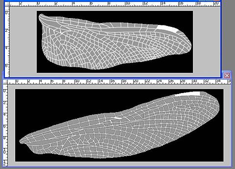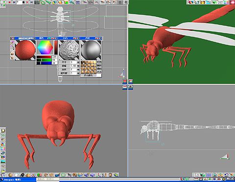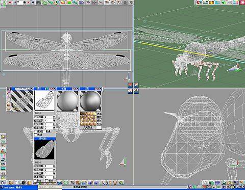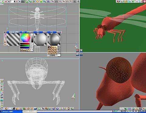 材質貼圖檔製作-翅膀材質製作製作翅膀的貼圖有兩種做法,一種是拿數位相機將蜻蜓翅膀拍下來,一種是參考昆蟲圖鑑裡的圖片自己繪製簡單的透明貼圖。則然而若依前者的方法現今要抓一隻蜻蜓應該不容易了吧!尤其在這都市叢林中。因此 此範例以參考書籍圖片來製作貼圖檔案。 第一種使用透明貼圖方式1. 開啟材質編輯器,在顏色選擇視窗中選擇希望的顏色,此以白色為例。 2. 在顏色選擇視窗上方選擇「一般透明效果」,可以在下方調整透明的效果。 3. 接著分別彩繪上每一個翅膀。 4. 在一對翅膀材質設定完成後將其作「向下連結」。 5. 按下鍵盤的「Ctrl+C」複製另一對翅膀,選擇「旋轉物件」工具,在「後視圖」小視窗中旋轉Y軸至180度,並移動至相對位置。 6. 將 2 對翅膀彼此作連結,如圖。