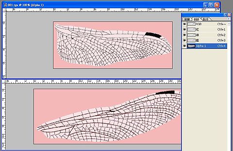 8. 接著在材質編輯器的顏色選擇視窗上方選擇「透明度:影像遮罩貼圖」,開啟透明度貼圖預覽視窗。 9. 在貼圖預覽視窗上按滑鼠右鍵開啟「讀取凹凸貼圖檔」,選擇剛剛儲存的 *.tga 檔案。 10. 複在預覽視窗上會出現「色板 (channel)」圖層上的圖形。按下「彩繪工具」物件就填上了圖形。 11. 分別設定好前翅、後翅,在重複前一方法的第 5、6 複製步驟,完成翅膀,如圖。
