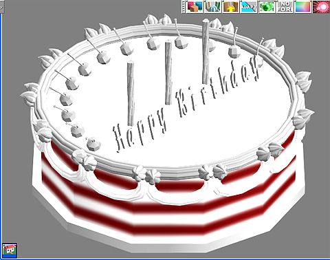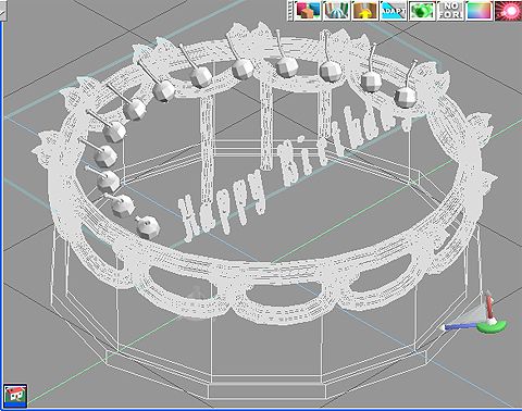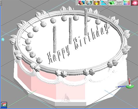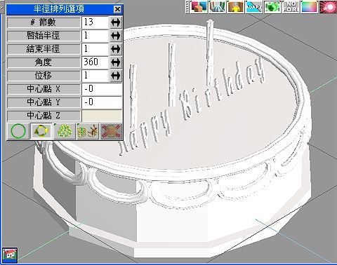 22. 目前蛋糕的基本造型大致抵定,接著可做一些點綴的物件,例如不可缺 的水果等等。筆者再此先製作一個櫻桃,先利用低解析度的圓球體作果實部份,再利用「新增正多邊形」工具增加一個五角多邊形,並且延展作蒂的部分,將彼此連結好之後,使用「物件建立半徑排列」作出半圓的排列,如圖 22。