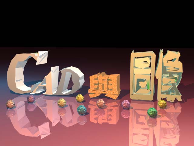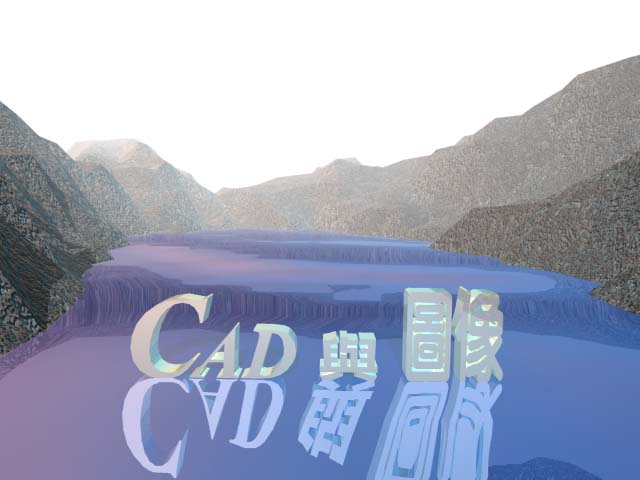 Resolution:控制景觀的細緻程度。越大的值,場景越細緻。提醒您X與Y的值要一致。 Scale:設定景觀的寬度與長度。 Create Water:Landmass會自動化的幫您在景觀中加入河流與湖泊。 Triangulate:啟用此選項可產生三角等分的物件,反之則為四角等分的物件。三角等分的物件會比四角等分的物件著色效果好,只是會花較久的時間。 Roughness & Height:此選項可控制產生的景觀為小山谷或是高山。 Noise:隨機的雜亂值。 Seed:亂數起始值。 Create:產生景觀地形。 Delete:相當於"Del"鍵,可刪除Landmass所產生的物件。 透過Landmass可以產生出相當不錯的景觀地形及湖泊(如圖7),我在水面上擺設了一個文字模型(如圖8),並且調整水面的反射以產生倒影的效果。接下來,調整攝影機並使用攝影機來拍攝畫面,這樣就完成了整個場景的佈局了。