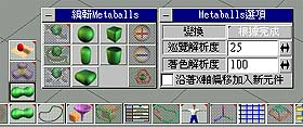 page 2-2 適用版本:trueSpace4.0以上 發表日期:1999.12.10 MetaballOK,完成路徑的記錄後,我想高手們應該早就知道該如何進行了吧!現在Metaball就可以 上場了。1. 點選 Metaball 工具,可開啟"編輯 Metaball 面板",如圖 10;在 Metaball 工具按鈕 上按下滑鼠右鍵,可開啟 "Metaball 選項"的屬性面板,如圖 10 右側。關閉"沿著X軸偏移 加入新元件",這樣您所有的 Metaball 都會在中心點中加入。