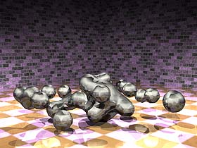 4. 重覆步驟 2 到步驟 3,加入 50 個 Metaball,同時也設定了每個 Metaball 的動畫。 OK,很簡單吧!我們完成了所有的設定後,您可以將這段動畫Render出來,如圖12。使用相同的方式所製作的效果,如圖13。