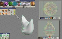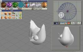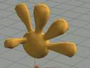 另外,手掌與手指的部份在一般的作法上是以一個一個大小不一的球體工具再將其變形而成。這樣的製作比較容易,不過在這裡卻不是我們所需要的方式。因此,我們可以將球體工具設定比較少的橫節數或是縱節數來製作一體成形的卡通手。然後使用面編輯功能在球體工具上任意選擇五個區域並且使用延展工具來當作卡通手的基本骨架,再使用平滑四角等分工具來修補各個面與面之間的角度。卡通手整體造型在這裡也大致告一段落了。(圖4、5、6、7) 最後再將已完成的物件一一的拼湊起來,一隻可愛又帥氣的卡通狗就算是完成了。 1 | 2 |