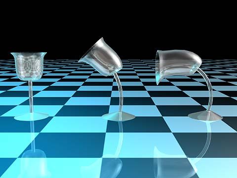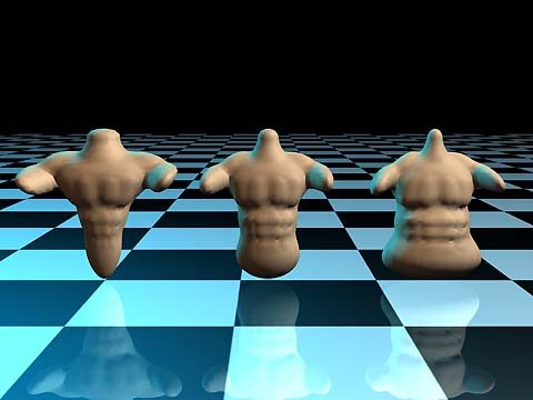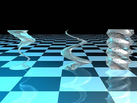 下面我們可以看到Bend、Twist、Taper的作用效果。 Bend:如圖二,畫面左側的杯子是原始形狀,中間及右側的杯子分別彎曲45度及90度。 Twist:如圖三,畫面中的右側的物件是長方體扭曲720度的結果;中間及左側的物件在,扭曲時,除了根據Z軸(垂直於地面)作用外,還可以調整其扭曲時位移的效果,便成像畫面中的螺旋形。 Taper:如圖四,畫面中間的物件是原始形狀,左側及右側的物件是經由Taper所處理的效果,其不同在於變粗的程度高低的位置不同。 Mesh Forge2所產生所有型態上的變化,都可以根據模型的軸向進行變化,同時其作用位置也可以加入變化;操作中的各種變化都可以經由其動畫錄製工具記錄起來。您還可以使用其堆疊修正器的方式,將數種不同的修正器效果加以組合在一起,所產生的變化效果更是無窮。 |