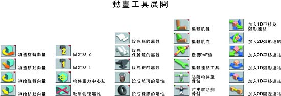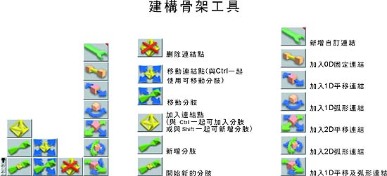 建構骨架工具 建構骨架或編輯骨架時,或是在骨骼上按下滑鼠右鍵即可進入編輯骨架模式。本工具中列出 – 新增與移動分肢,自由度等編輯工具。