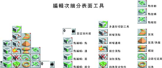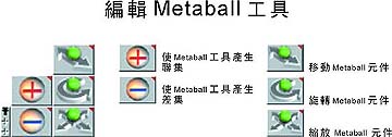 編輯工具組trueSpace 新的物件編輯觀念,按下滑鼠右鍵可進入物件編輯模式 – 如 Metaball編輯、多邊形編輯、NURBS 編輯、曲線編輯等不同的編輯模式。 進入編輯模式後,相關的操作工具即會出現在方塊(Corner)中方便您使用,展開方塊即如下所列的各式工具。 在場景中空白的地放在次按下滑鼠右鍵,可退出編輯模式。 編輯次細分表面工具 當模型啟動次細分表面 (Subdivision Surface) 時,您按下滑鼠右鍵即可物件編輯的模式,同時即時顯示次細分表面的狀態,此工具列將出現於編輯物件的附近。此工具列中列出 – 點編輯操作、延展工具組及次細分表面的銳利度。 編輯 Metaball 工具 在 Metaball 元件上按下滑鼠右鍵,可進入 Metaball 編輯模式,此工具列將出現於編輯Metaball的附近。此工具中列出 Metaball 元件的巡覽工具、Metaball 連集與插集的效果。