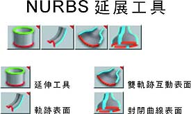 NURBS 延展工具組 繪製曲線後,在繪製板的附近即會出現此工具列,此為曲線擠壓成型(Extrude)的四種模式。