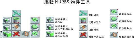 編輯 NURBS 物件工具 當 NURBS 基本元件與曲線擠壓成型等物件,按下滑鼠右鍵可進入編輯 NURBS 物件的功能。其中列出補面的選取工具、修整工具、巡覽工具等。
