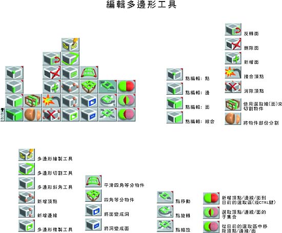 編輯多邊型工具 在多邊形物件上按下滑鼠右鍵,可進入編輯多邊形的模式。此工具中列出 – 點編輯選取工具、多邊形編輯、多邊形細分、巡覽及布林運算等工具。