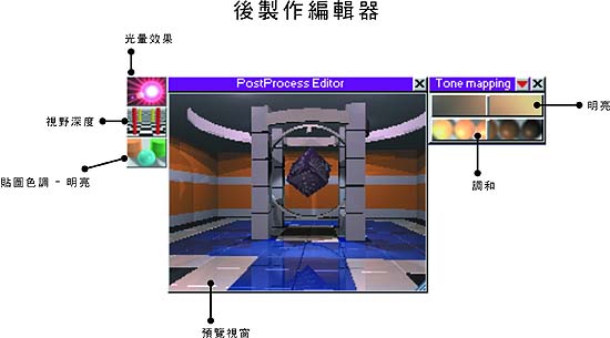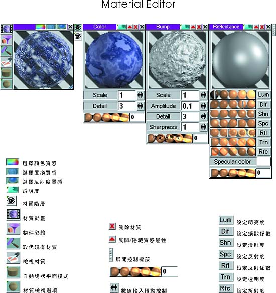 編輯器此處列出常用的編輯器 – 材質編輯器、3D 彩繪工具、關鍵畫面編輯器與後製作編輯器。 材質編輯器 快速鍵為 M,可開啟此編輯器,下圖為展開的畫面。