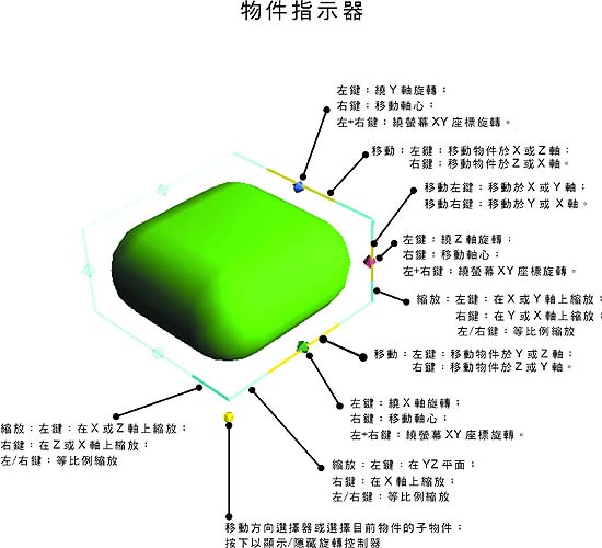 3D 控制器此處列出常用的 3D 控制器。 物件指示器 物件指示器為 trueSpace 中新的操作工具,請務必熟悉此工具,在 trueSpace 中大量的使用物件指示器操作 – 如物件巡覽、點編輯巡覽、貼圖模式控制、NURBS 物件編輯、Metaball 元件…都使用物件指示器。