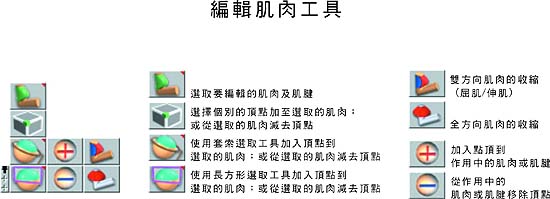 編輯肌肉工具 在已貼上肌肉的模型上按下滑鼠右鍵,即可進入肌肉編輯模式。本工具中列出 – 肌肉與肌腱選取工具、伸肌與屈肌模式等編輯工具。