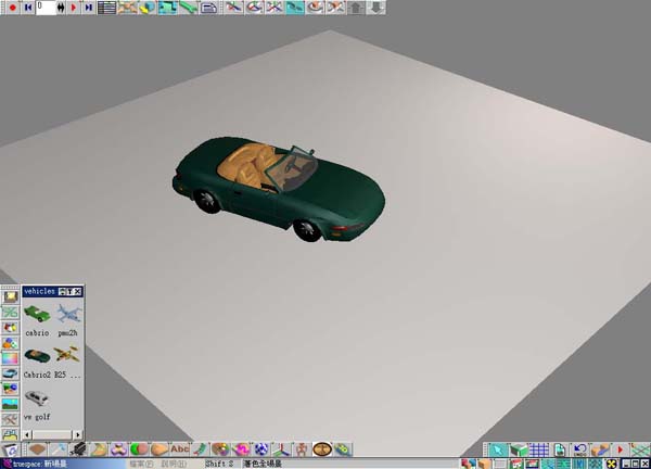 新手上路 頁數:3/5 畫面著色 再正常狀態下我們所看到的物體的實體顯示,是透過DirectX或OpenGL顯示卡即時的模擬顯示,這並不是真實的輸出效果,所以必須透過算圖著色的方式,才能夠將真實的效果表現出來。 此時請按下「著色全場景」圖示,trueSpace 於是開始進行著色。trueSpace提供四種場景著色的方式: