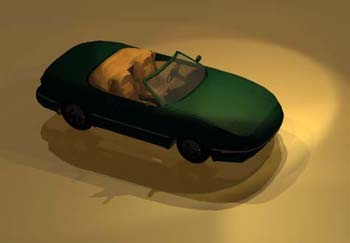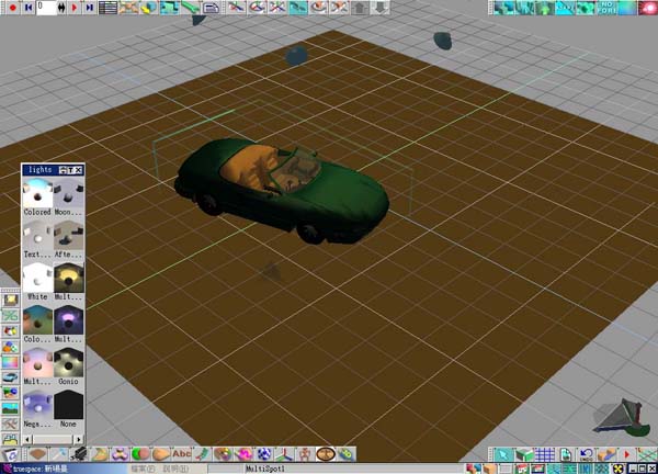 好了,我們完成了倒影,接著,再按下「光源資料庫」圖示,會開啟「光源資料庫」面板,這是trueSpace 已經做好一些打光範本,您不需要自已加入光源,只要按一下任何圖示,trueSpace 就會幫您擺好並設定好光源。我們選擇其中的一組"MultiSpot1"光源,接著場景中光源便會重置為MultiSpot1光源所設定的狀態,這是六個聚光燈所構成的光源設定,如圖。