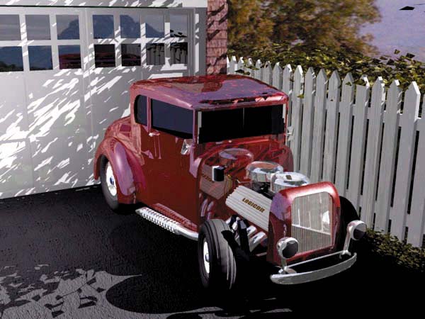 這個場景是由trueSpace3所製作出來的。這輛汽車二個Metaball所構成的復古造型。車體的尾部與中間部份使用Metaball的整體造型結合後,我將Metaball轉換成多邊體。成型的過程很簡單,先將物件切成一半,並且複製它。再加上布林運算神奇的效果,來完成出車門、車窗及車身,除了部份配件。