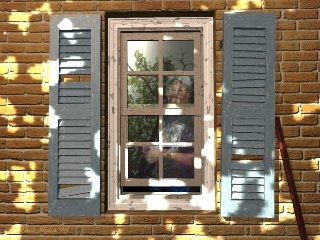 您可能沈醉在 trueSpace 場景中所有的模型都是精巧的 3D立體模型。這一點,我不和您爭辯,如果喜歡,儘管做!祝您好運!但是當您發現到您費時費力的去找尋或親自製作完成的模型,可能在您的場景之中並不是一個主要的焦點;甚至更糟的是,有時這些額外的模型,反而會破壞整個場景的完整性。這也正是我所要表達的重點,一個好的創作者應該知道自己的需要。事實上,在這個文章中,我提供給各位一個完美又簡單製作完成的範例。平面,取代了 3D 樹木模型,這正是我們所須要的;尤其是當完整 3D 模型的樹木,在光跡追蹤下它並無法提供較柔和的陰影。另一個不錯的點子,您注意到了嗎?一個男子站在窗前,同樣是使用“貼圖裝飾”的效果。