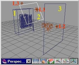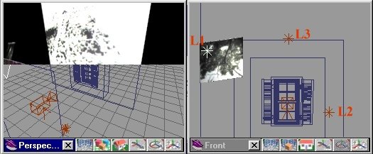 現在您只須要光源來完成這張圖片。場景中只有一盞光跡追蹤陰影的光源 (L1),這展泛光燈照射穿過平面#2 (樹木 TXR 材質的平面),並產生投射陰影在牆上。這個部份須多次的操作,先設定光源的強度在 1.0 左右,然後您可以移動光源或是平面的位置,來產生理想的投射陰影。這可能頗令您頭痛及二眼昏花,而且花許多的時間在檢查任何移動並著色小視窗。請加入另一個平面,將此平面拉大,將其放在窗戶/牆壁之前,彩繪上白色的材質。